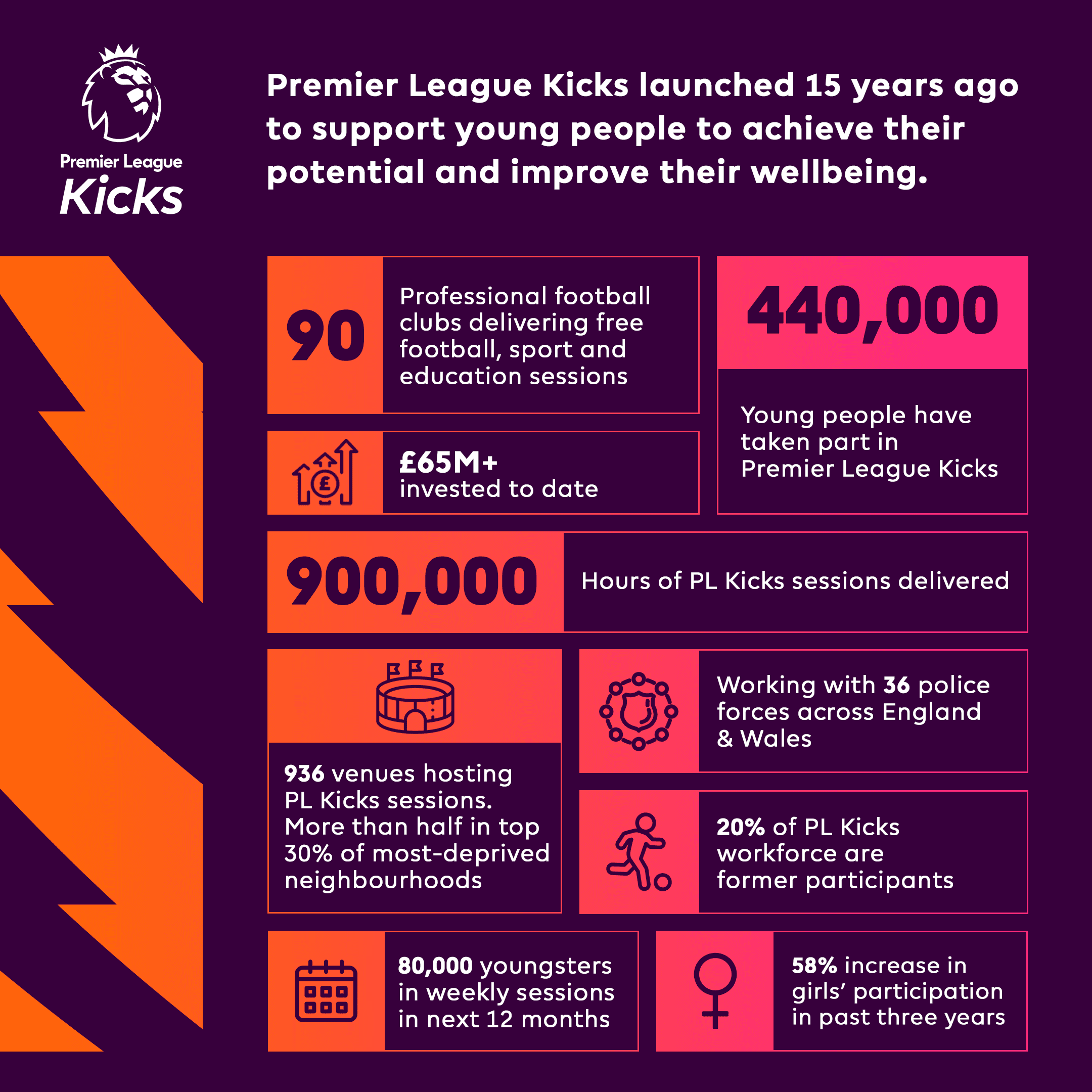 The Premier League is celebrating 15 years of its flagship community programme. Premier League Kicks has supported hundreds of thousands of young people to achieve their potential and improve their wellbeing through free weekly football sessions and educational workshops.