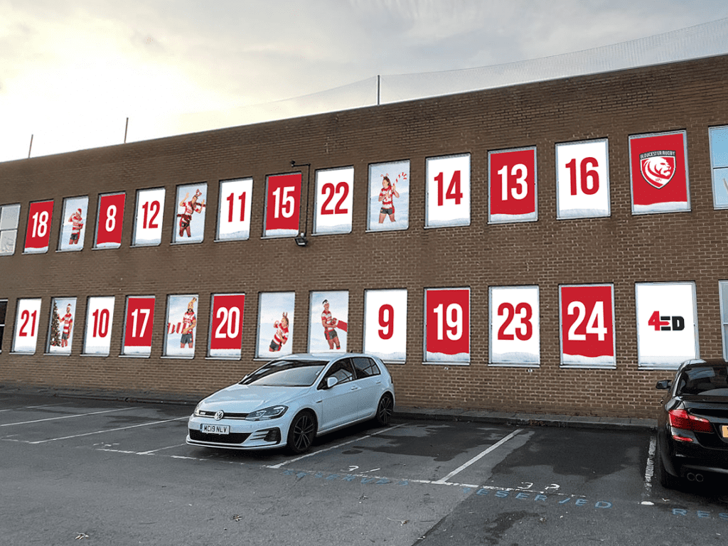 23 rugby players from Gloucester Rugby and Gloucester Hartpury have joined Ed Slater to star in the UK’s BiGGEST advent calendar, displayed afront a huge office building on a main road in the city. The calendar, which is in its fourth year, has previously been adorned with various Christmas animations as each day throughout December a new door is opened – making it a huge hit with local residents, with hundreds of social posts each festive season championing its appearance.