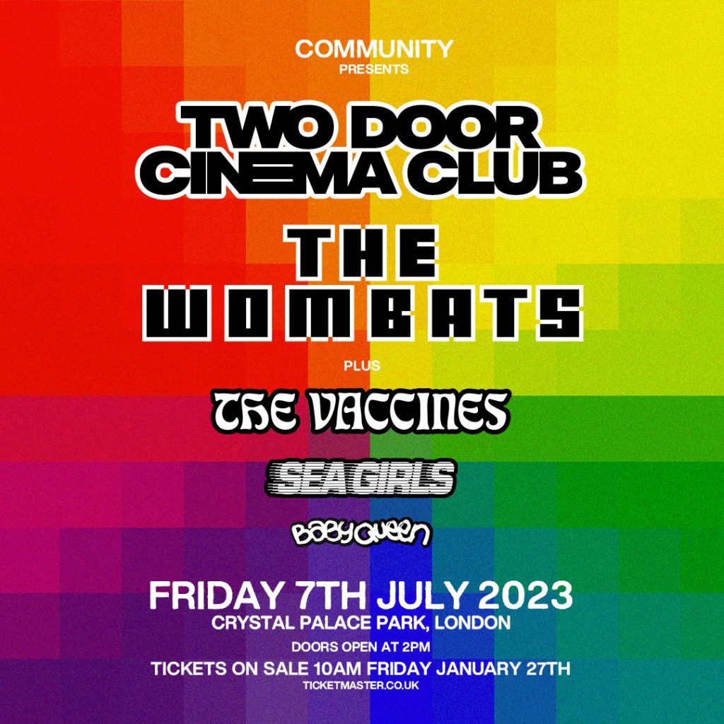 London’s beloved indie-rock day out Community, has today announced a special one-day ‘Community Presents:’ show with two massive headliners Two Door Cinema Club and everyone’s favourite marsupials The Wombats – taking place at London’s Crystal Palace Park on Friday 07 July. The special outdoor gig will also feature modern genre torchbearers The Vaccines, the fast-rising Sea Girls and alt-pop star in the making Baby Queen. Get ready to sing along to the biggest anthems and dance the night away, at the sunny indie-rock party this summer at Crystal Palace Park. Tickets go on general sale from 10:00AM on Friday 25 February from www.ticketmaster.co.uk.