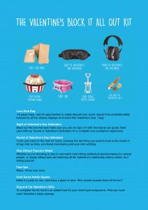 The first of the three kits will especially appeal to singles, but is available for anyone who wants to avoid Valentine’s Day all together. The Block it all Out Kit comes complete with ear defenders and an eye mask, to make sure the recipient neither hears nor sees any whiff of the annual love fest. Other treats include a packet of sick bags, if the gushing displays of affection all become a bit too much, and a bottle opener, because why should couples have all the fun? There’s even something for the cat, because as we all know, our loyal pets will never break up with us.