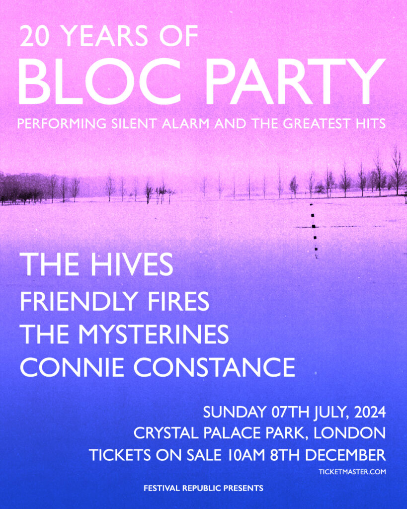 “We’ve been having so much fun playing shows over the past year, so it makes sense to do something special for old and new fans, celebrating twenty years of Bloc Party. We heard from a lot of people that they couldn’t get tickets for the Silent Alarm gigs, so a one-off summer party playing that and the bangers feels like the right thing to do.”
