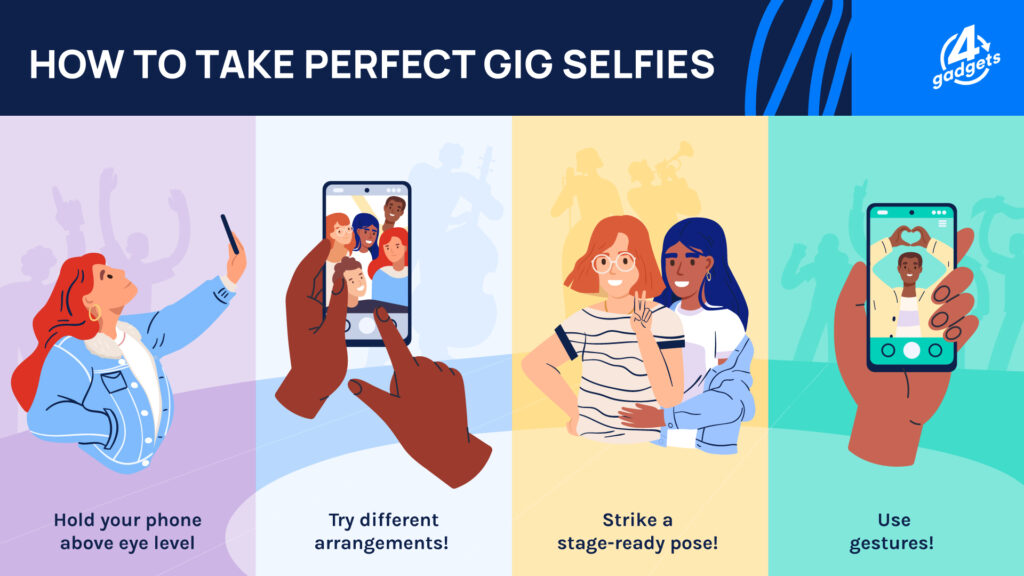 Creative posing, especially in group selfies, can turn a simple photo into a memorable one. Experimenting with different arrangements, like forming a semi-circle with the stage in the background, jumping together, or mimicking the artist’s pose, adds fun and energy to your photos.