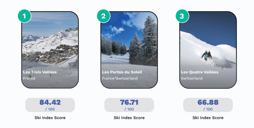 Les Trois Vallées topped the ski index with a score of 84.42 out of a possible 100 points. Nestled in the Northern French Alps and the largest linked ski area in the world, Les Trois Vallées has 600km of slopes across eight resorts, including well-known names like Val Thorens, Courchevel, and Meribel.