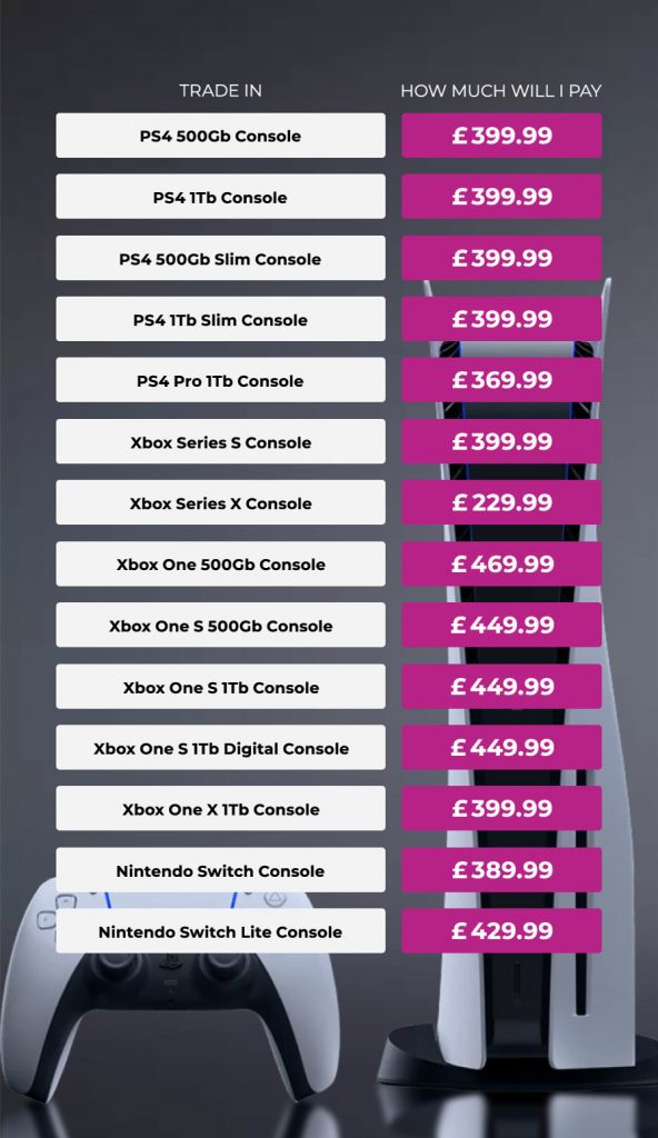 A table detailing how much gamers will save on a new PS5 when trading in consoles