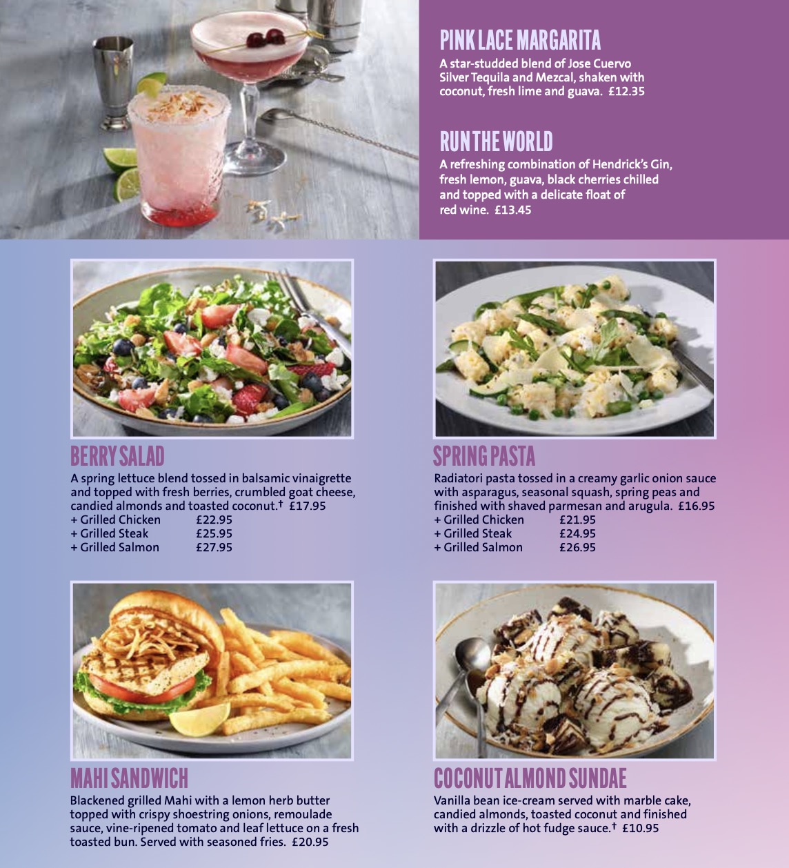 In addition to the cocktails, Hard Rock Cafe London and Hard Rock Cafe Piccadilly Circus will offer a special, limited-time menu through March and April including: a Spring Pasta, Mahi Burger, Berry Salad, and a Coconut Almond Sundae.
