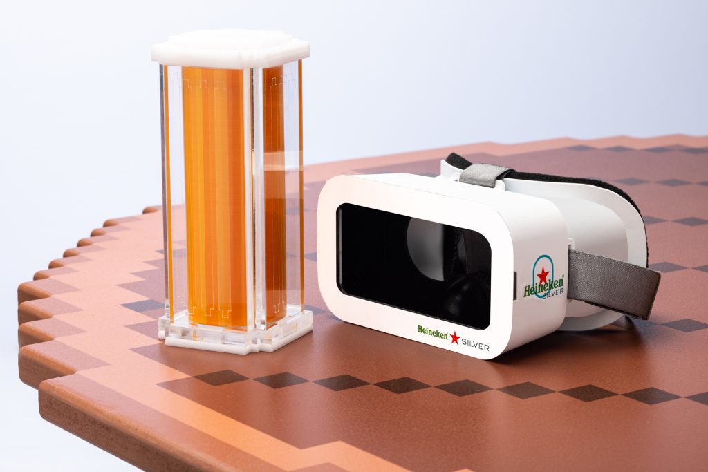 Staying true to its metaverse origins all of the furniture and décor in the Heineken Silver IRL META-BAR has a blocky, pixelated appearance, the staff act like non-playable characters (NPCs) and the bar is sparsely populated. What’s more, to dial-up the absurdity all visitors are required to put on some of lowest tech ‘virtual reality’ headsets ever seen.