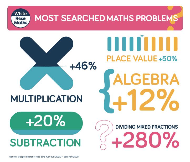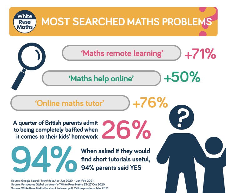 The maths divide has multiplied during lockdown, as new research reveals parents remain in the dark about basic calculations such as place value, multiplication and subtraction. It seems only a fraction of parents can do maths the modern way, as searches for ‘maths remote learning’ and ‘online maths tutor’ increased by 71% and 76% respectively, whilst searches for ‘maths help online’ were up by 50% in Jan/Feb 2021, during the third lockdown.