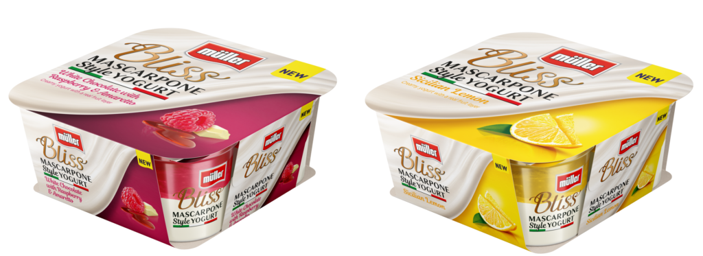 Both Müller Bliss Mascarpone Style Sicilian Lemon and Müller Bliss Mascarpone Style White Chocolate with Raspberry & Amaretto are now available in Asda, with a wider rollout from September, in 4-pack multipacks (RRP £2.75).
