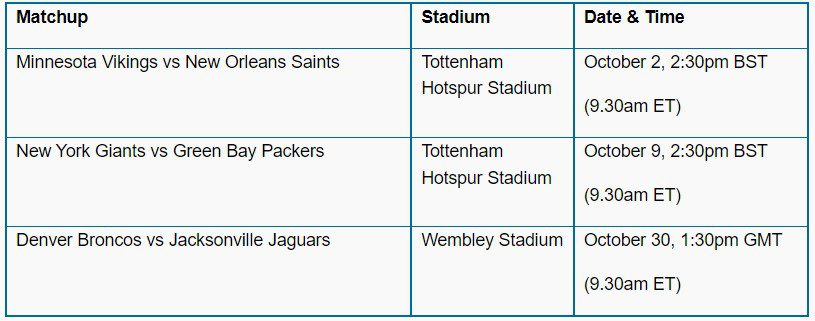 The New Orleans Saints and Minnesota Vikings will each play in the UK for the third time, both teams having won on two previous occasions. They will make their debuts at Tottenham Hotspur Stadium on Sunday, October 2.