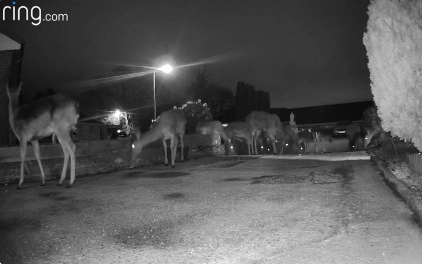 A Ring camera has captured the moment dozens of deer and their young came to graze at a front garden in Plymouth.