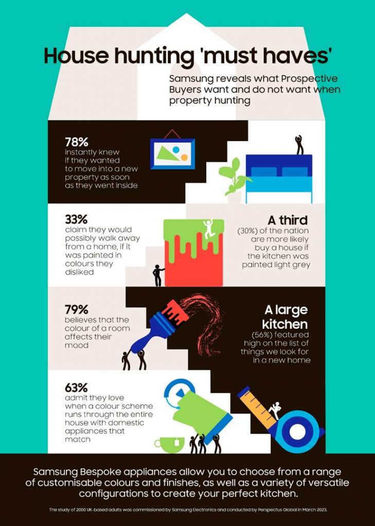 New research by Samsung Electronics UK Ltd. suggests grey is the new magnolia, with a third (30 percent) of the nation saying they would be more likely to buy a home if the kitchen – the most important room, according to nearly four in ten (37 percent) – and living rooms were painted “light grey”.