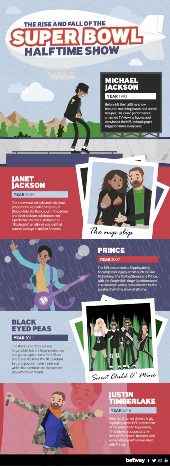 There’s no doubt that the NFL has benefitted just as much from the switch to concert-style performances. Ratings now typically rise at halftime as viewers tune in to watch the spectacle, and the last nine Super Bowls have all seen American television audiences of 100 million and above. A 30-second Super Bowl commercial spot, which cost $850,000 back in 1992, is now worth $5m, an increase of $3.5m after accounting for inflation.