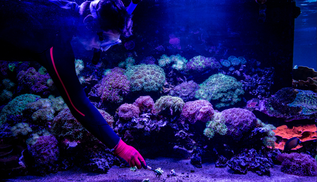 The Aquarists were seen raking the display beds and weaving through the corals to make sure they were thriving and looking their best, whilst some needed a little pruning to ensure they remain healthy. The clipped corals were then delicately put aside to be propagated to help improve diversity at other locations.