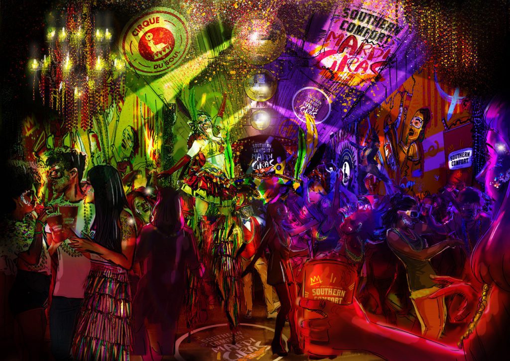 As part of the Mardi Gras celebrations, Southern Comfort also unveiled a new, limited-edition bottle. Under the watchful eye of New Orleans street artist Brandan ‘BMIKE’ Odums, London-based artist Jade Pearl has created this year’s Mardi Gras limited edition bottle, The bottle contains a QR code, serving up Southern Comfort cocktail recipes or exclusive chances to win prizes – including free tickets to the London party on 26th Feb. The limited bottle is now available in grocery stores nationwide.
