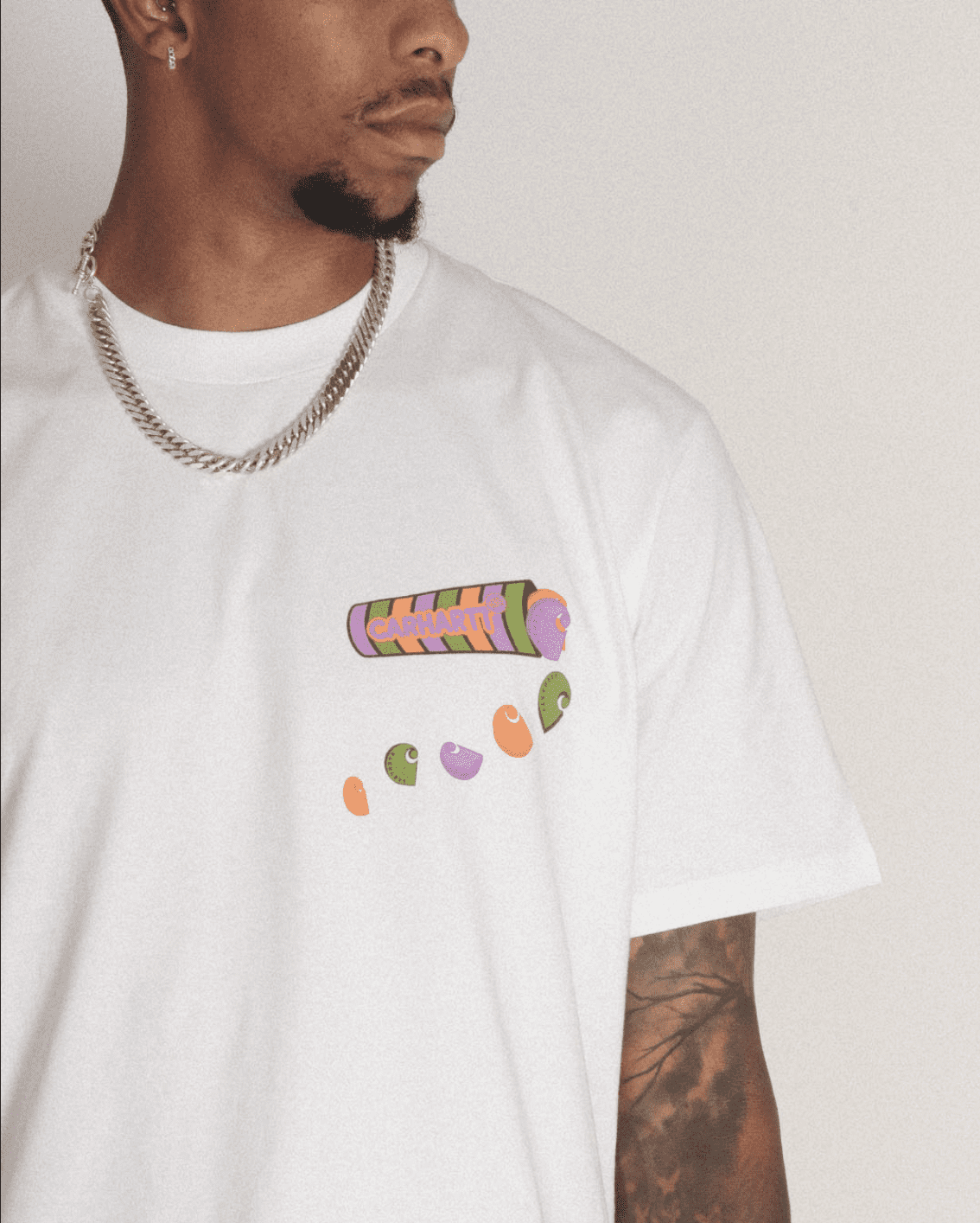 The Carhartt WIP Frolo SS T-Shirt in White has a multicoloured graphic design printed on the chest, inspired by retro 90’s candy.