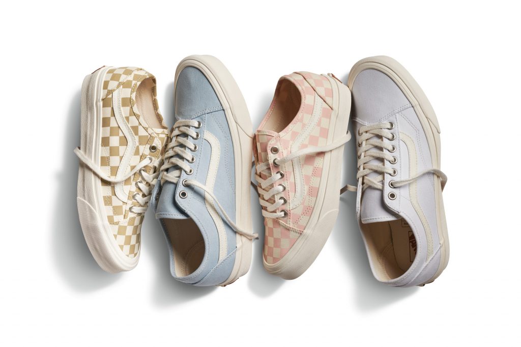 The Old Skool Decon taps into water-based inks and dyes with four neutral colorways, including white/natural, winter sky/natural, cornstalk/natural canvas in Checkerboard and peachy keen/natural canvas in Checkerboard. Vans Eco Theory collection also includes the Sk8-Hi Tapered and Authentic in the same range of colorways as well as black/natural.