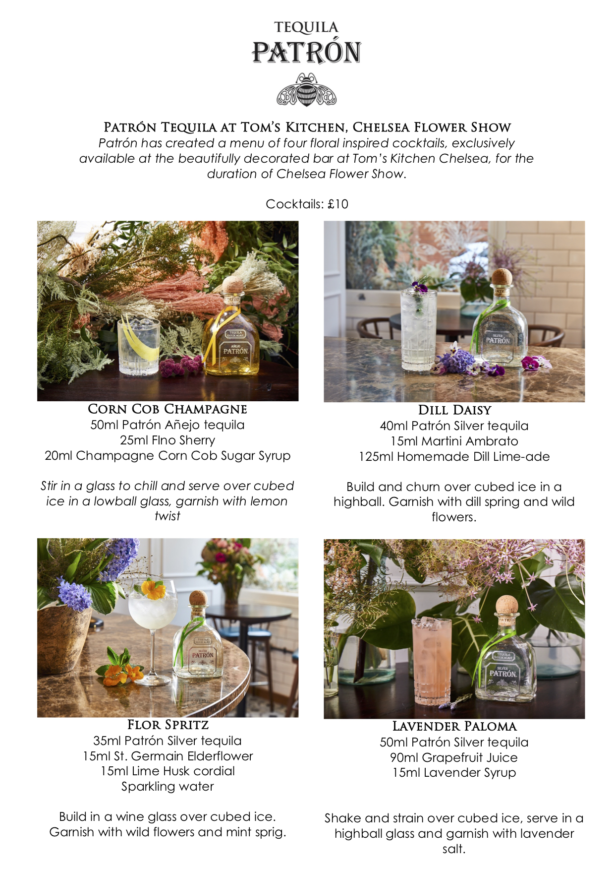 Patrón is partnering with Michelin starred chef, Tom Aiken, and his restaurant Tom’s Kitchen. Exclusively for Chelsea Flower Show, Patrón is creating four beautifully floral-inspired cocktails that will be on the menu for the duration of Chelsea Flower Show, such as the Champagne Corn Cob Cocktail as shown below: