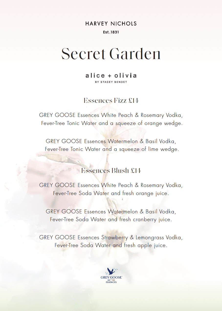 A partnership made in heaven; Grey Goose x Harvey Nichols, have teamed up with iconic New York fashion brand Alice + Olivia’s Secret Garden Terrace for London takeover.